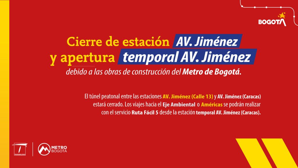 La estación Avenida Jiménez sobre la avenida Caracas dejará de operar este sábado 7 de febrero para permitir la continuidad de las obras de la Primera Línea del Metro. De manera simultánea, entrará en funcionamiento la estación temporal.