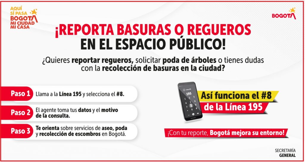 ¡Aquí sí pasa! En Bogotá, mi Ciudad, mi Casa se habilitó la opción 8 de la Línea 195, un canal directo para que la ciudadanía pueda resolver dudas, presentar reclamos y reportar situaciones relacionadas con el servicio de aseo, la poda de árboles y la recolección de escombros en la ciudad.