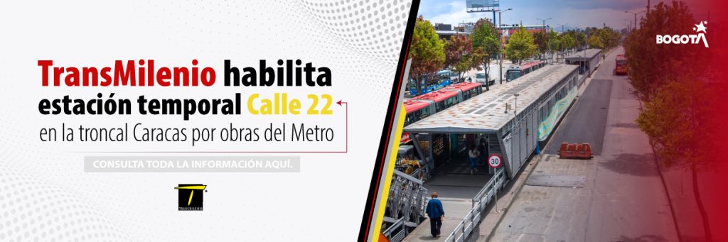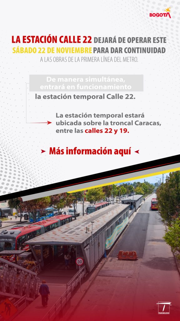 Bogotá, 14 de noviembre de 2025. A partir del sábado 22 de noviembre, la estación Calle 22 de la troncal Caracas suspenderá su operación para permitir el avance de las obras de la Primera Línea del Metro de Bogotá. Como alternativa, TransMilenio pondrá en servicio la estación temporal Calle 22, ubicada sobre la avenida Caracas entre calles 22 y 19.